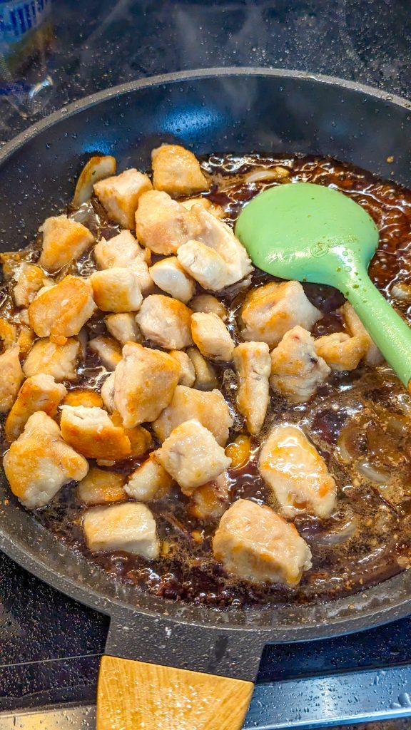 - Add red pepper flakes to taste, then add the chicken and onions back in to rewarm.