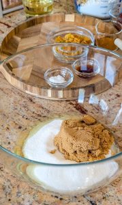 1. In a large bowl, whisk together the egg whites, avocado oil, applesauce, vanilla extract, and both sugars until smooth and well combined.