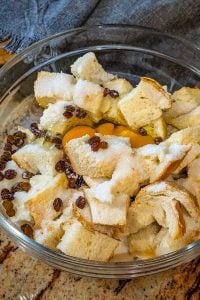 2. Grease a 9×13-inch baking dish. Place the cubed bread and raisins in the dish and toss gently to combine.