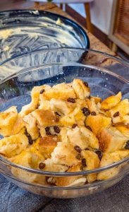 1. Pour the custard evenly over the bread and raisins. Let it sit for 10 minutes so the bread absorbs the liquid.