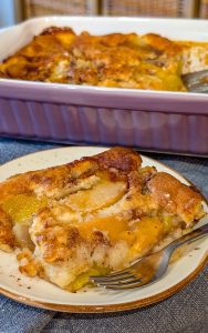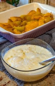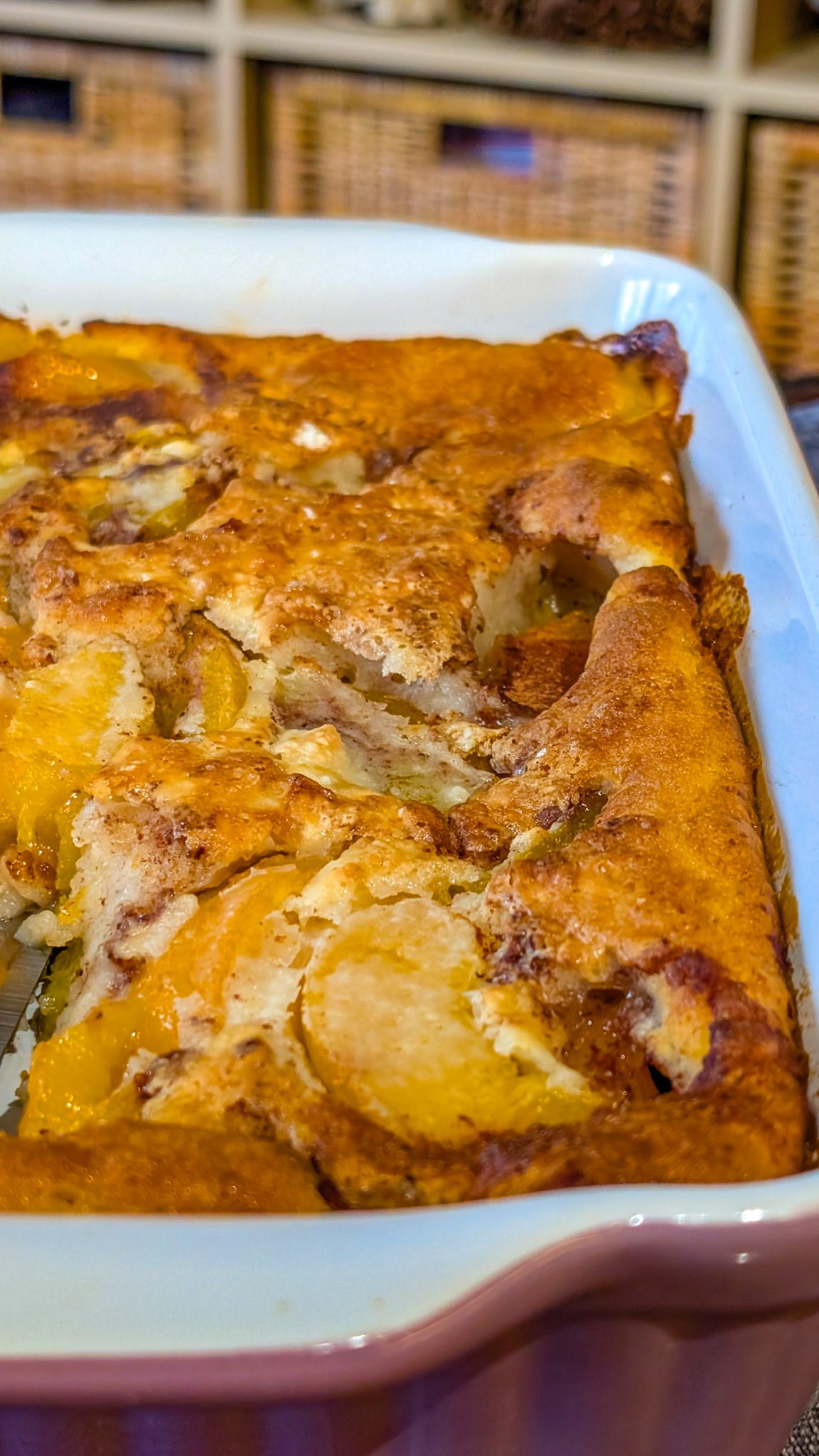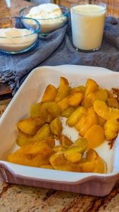 - Pour the batter evenly over the peaches in the baking dish. Do not stir—the batter will bake into a golden, fluffy topping while the peaches bubble underneath.