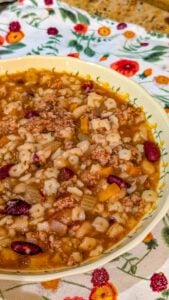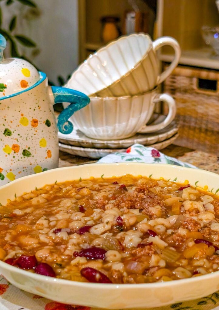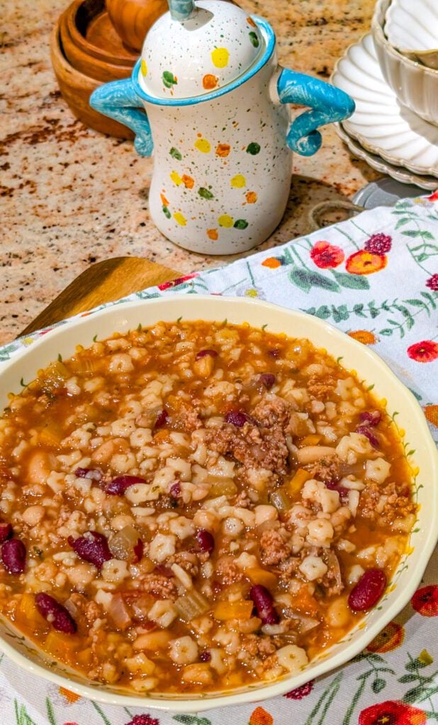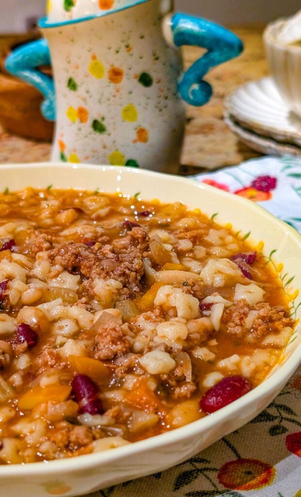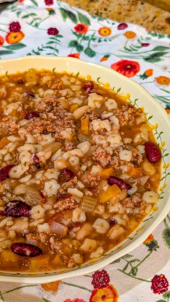 What makes this soup so special is the depth of flavor that develops as it cooks low and slow. The combination of ground beef, onions, carrots, celery, and garlic creates a savory base, while kidney and white beans add heartiness and texture. The tomato broth is perfectly balanced — rich without being heavy — and infused with classic Italian herbs that make every spoonful taste like comfort.