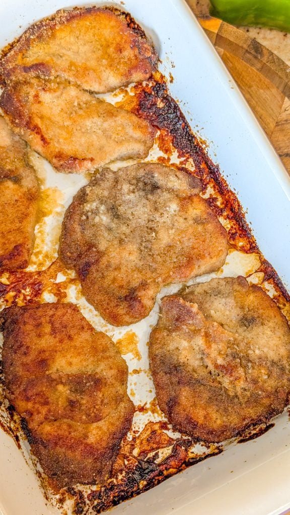 2. Bake for 25–30 minutes, or until the pork chops reach an internal temperature of 145°F (63°C) and the coating is golden and crisp. Thicker chops may need a few more minutes.