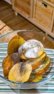 1. Add the olive oil, minced garlic, thyme, oregano, basil, and grated Parmesan. Sprinkle with salt and freshly ground black pepper. Toss everything together until the potatoes are evenly coated.
