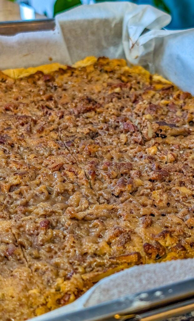 - Pour the pecan mixture evenly over the partially baked crust, spreading it gently to cover the entire surface.