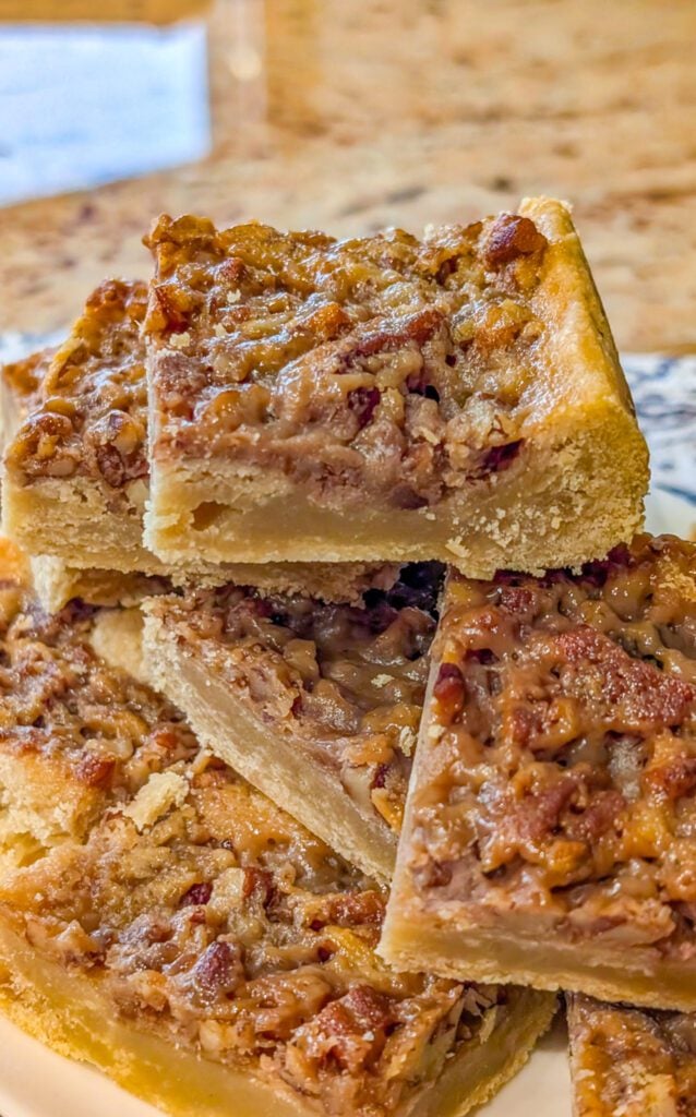 Store leftover pecan pie bars in an airtight container at room temperature for up to 3 days or in the refrigerator for up to 5 days. To freeze, allow the bars to cool completely, then wrap them tightly in plastic wrap and place them in a freezer-safe container. They can be frozen for up to 2 months. Thaw overnight in the refrigerator before serving.