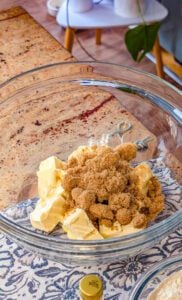 - In a medium saucepan over medium-high heat, add the remaining 1 cup butter, 1½ cups brown sugar, and corn syrup. Stir constantly until the butter melts and the ingredients combine smoothly.
