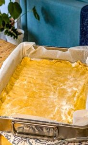 - Transfer the dough to the prepared baking pan. Press it evenly into the bottom of the pan using your hands or an offset spatula to create a smooth crust layer.
