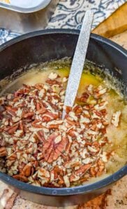 - Add the chopped pecans to the caramel mixture and stir until all the pecans are evenly coated.