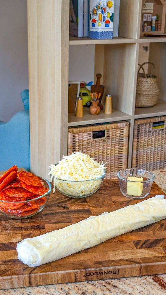 - Roll the dough into a log with the pepperoni and mozzarella inside.