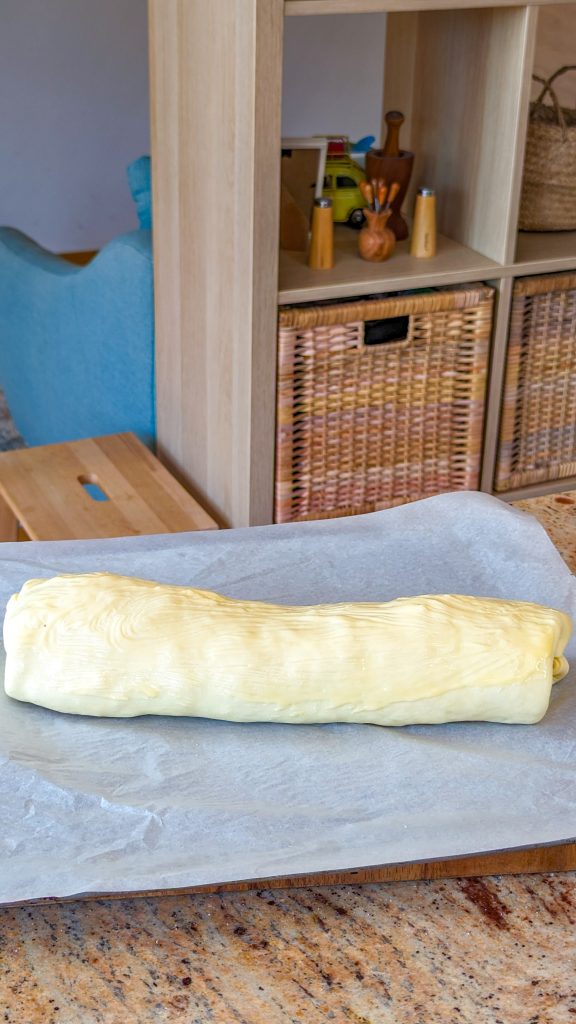 - Put the roll on to a parchment paper-lined baking sheet or silicone baking mat and brush the melted butter across the top.