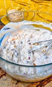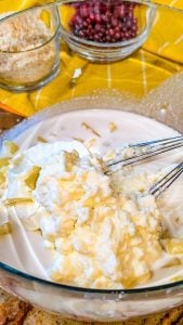 - Gently fold in the whipped topping, drained crushed pineapple, chopped cherries, and pecans until fully incorporated.