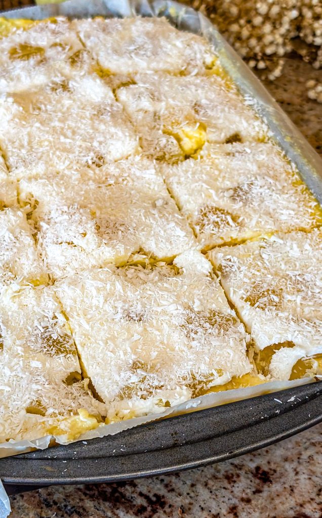 - Evenly sprinkle the toasted shredded coconut over the top for extra flavor and texture.