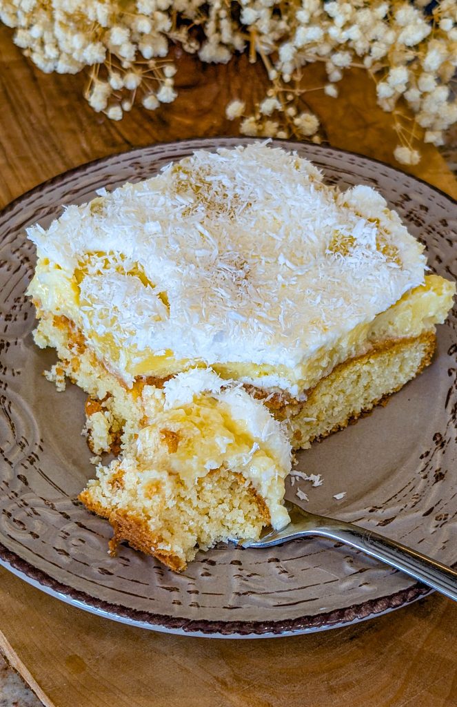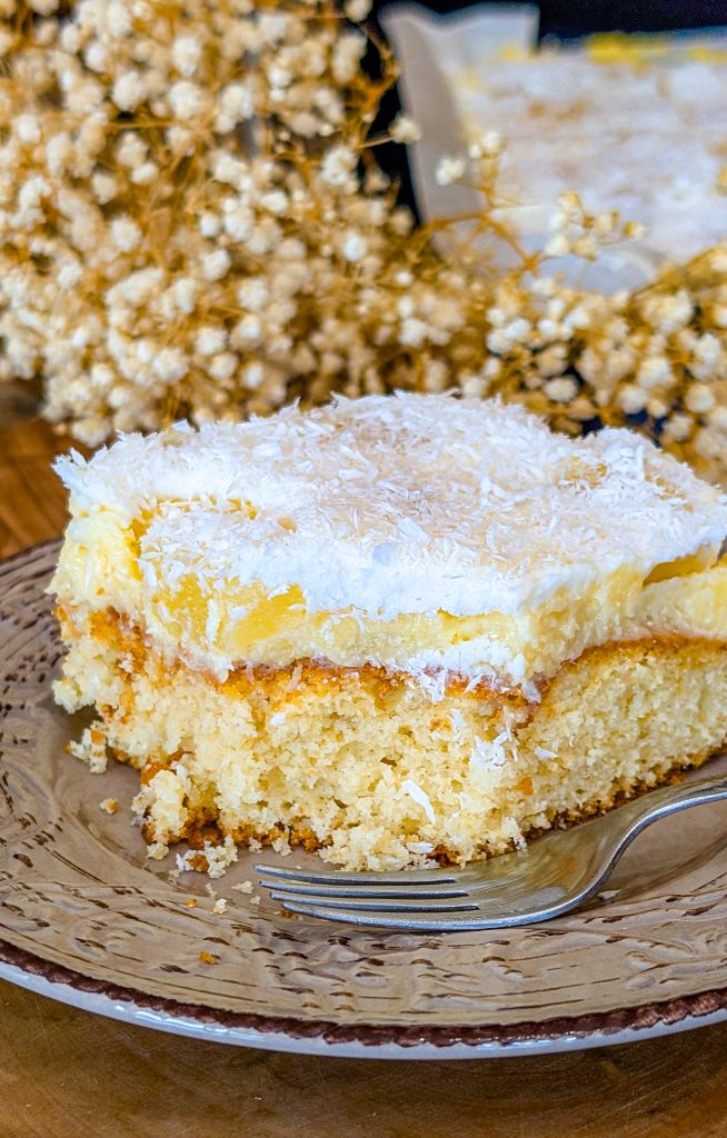- Refrigerate the cake for at least 4 hours, or preferably overnight, to allow the cake to fully absorb the coconut-pineapple mixture.