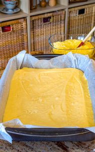 - Prepare the white cake mix according to the package instructions and bake in a 9×13-inch pan. Allow it to cool slightly, so it’s still warm but not hot.