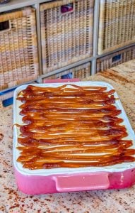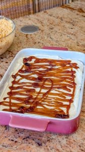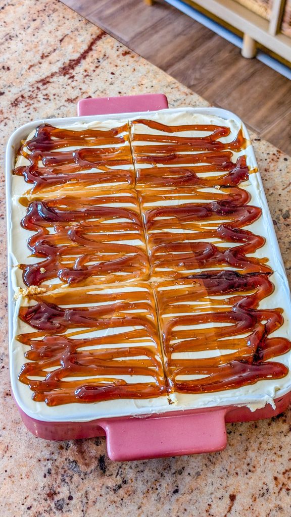 - Repeat the layering process two more times—crackers, cream cheese, then caramel—until all ingredients are used, finishing with a layer of caramel on top.