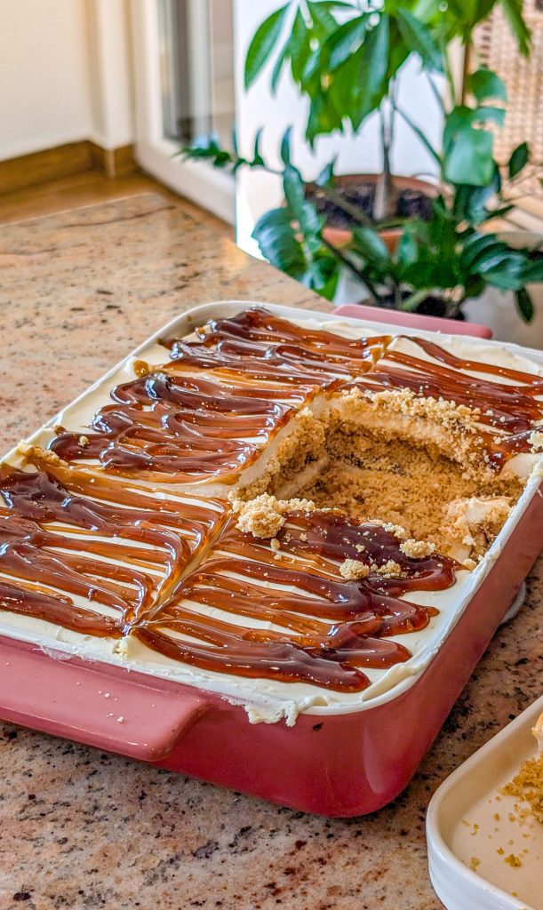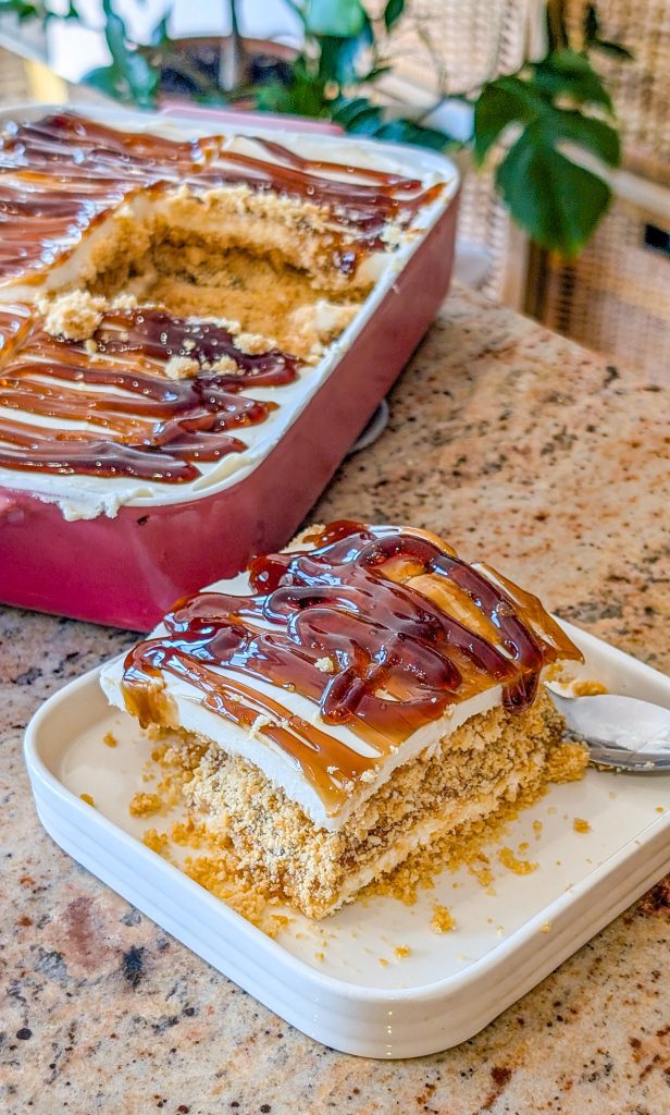 - Slice into squares and serve chilled. Enjoy the creamy, sweet, and slightly salty layers of this indulgent no-bake dessert!