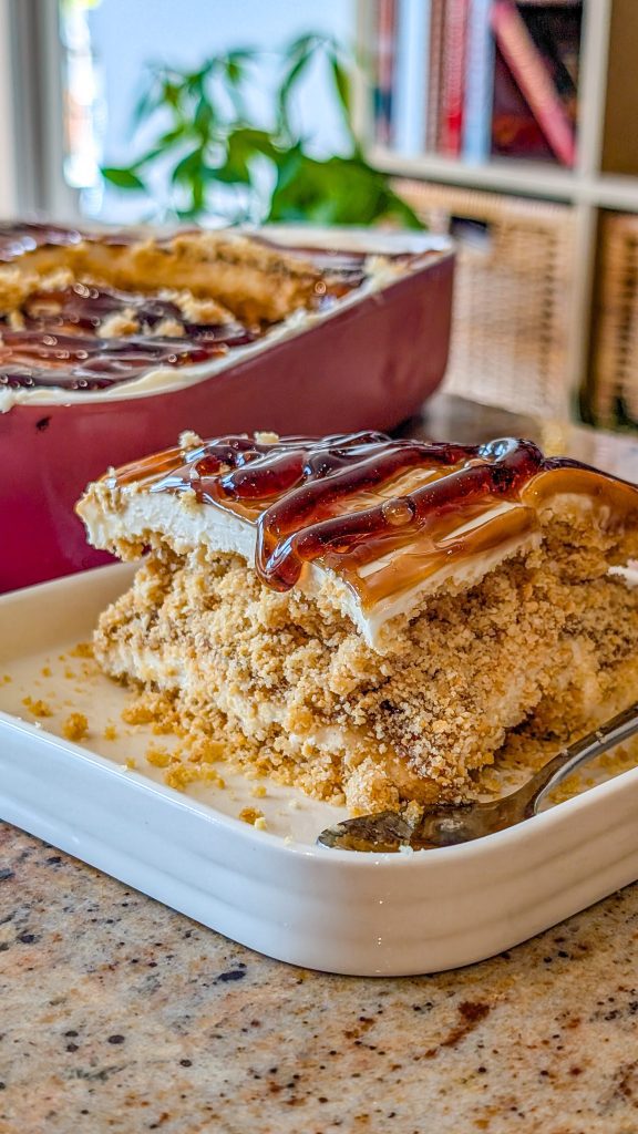 Store your icebox cake covered in the refrigerator. It keeps well for up to 3–4 days, and in fact, the flavors develop even more after sitting overnight. While I don’t recommend freezing the assembled cake—since the crackers may become too soft—you can freeze the filling and caramel separately, then assemble when ready to serve for a fresh dessert experience.