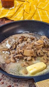 6. Place the butter and mushrooms into the skillet over medium heat, and saute until the mushrooms begin to soften.