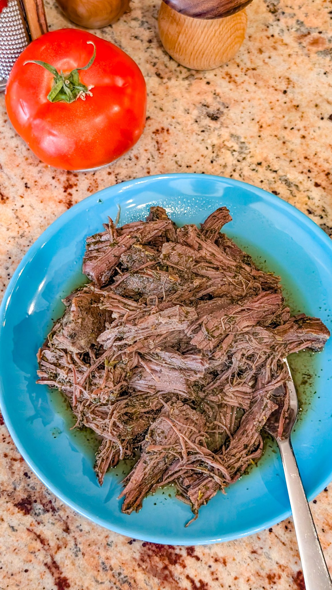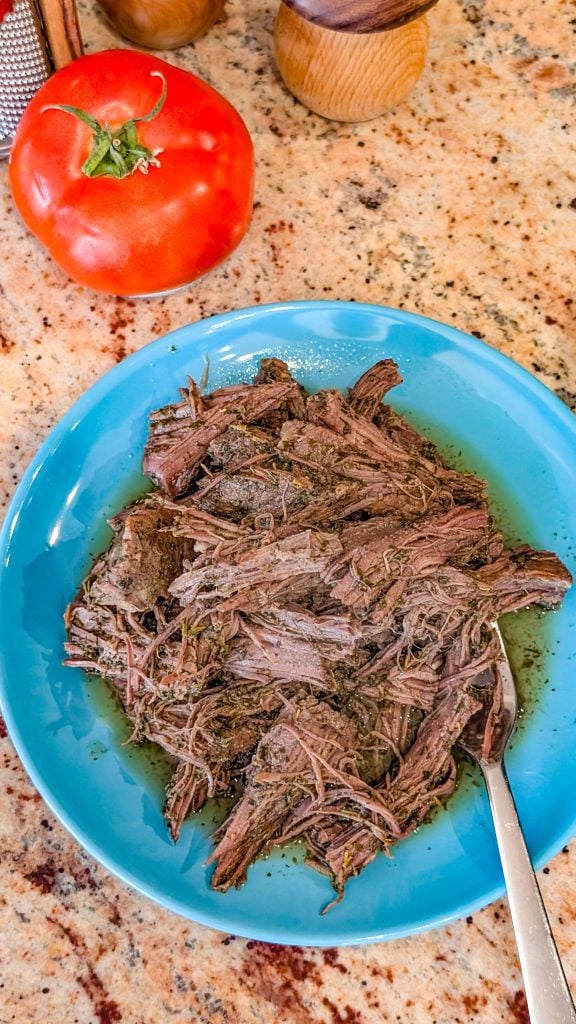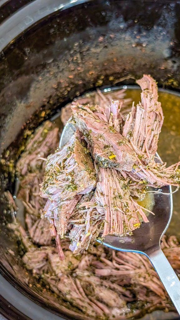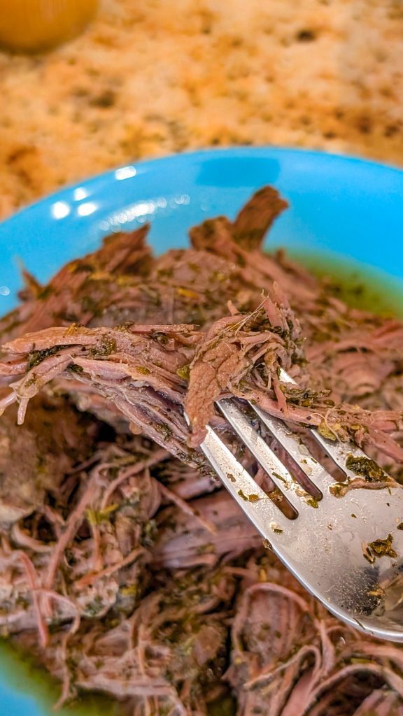 - Once cooked, remove any large bones if present, then shred the roast using two forks.
