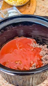 - Add the cooked meat to your slow cooker. Pour in the marinara sauce and crushed tomatoes. Sprinkle with Italian seasoning, salt, and pepper, then stir to combine.