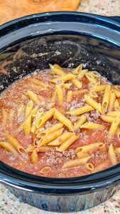 - Add the uncooked ziti pasta directly into the slow cooker, stirring well to coat the pasta evenly with the sauce.