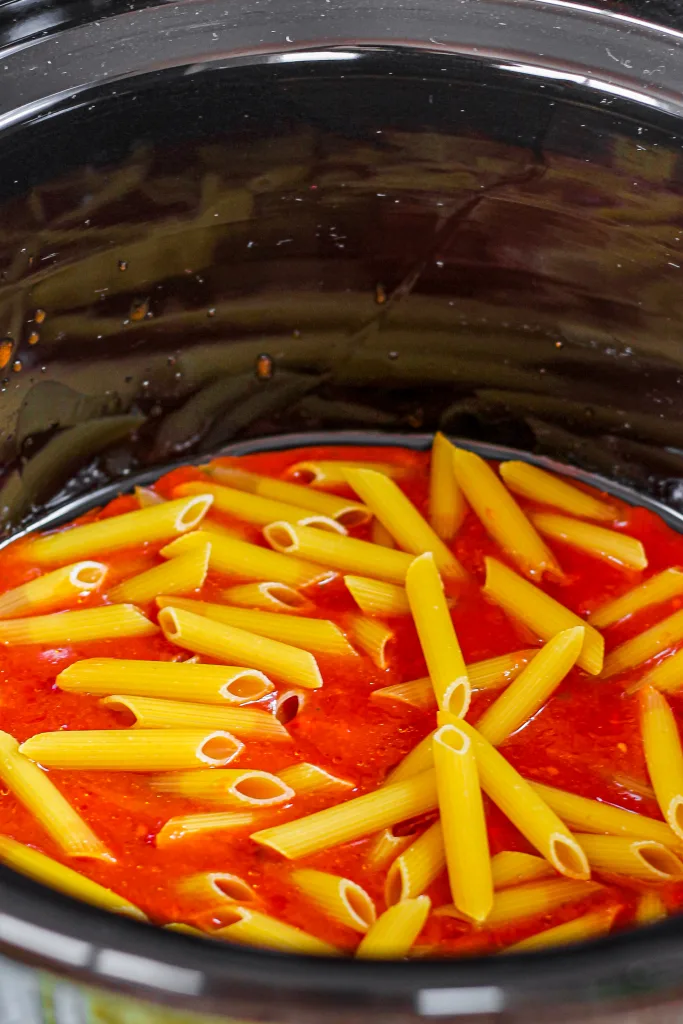 - Grease your slow cooker and add two and one-third cups of sauce inside. Add ⅓ of the uncooked pasta to the slow cooker.