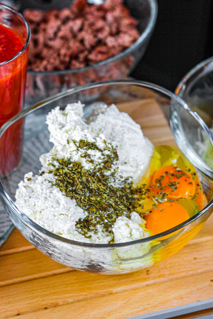 - Beat the eggs in a large mixing bowl. Add the ricotta cheese and mix well to combine.