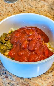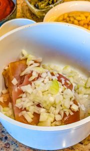- Add the diced onion, minced garlic, great northern beans, navy beans, corn, diced tomatoes with green chilies, chopped green chilies, cumin, chili powder, oregano, and smoked paprika.