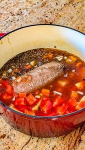 - Add the browned ground beef on top of the vegetables. Pour in the beef broth and diced tomatoes. Sprinkle in the Worcestershire sauce, salt, black pepper, and dried thyme. Stir gently to combine all ingredients.