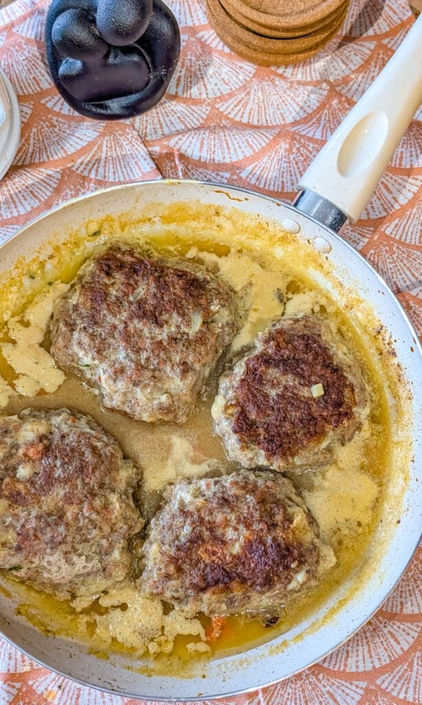 6. Return the cooked patties to the skillet, turning them to coat evenly in the sauce. Reduce the heat to low, cover, and let the hamburger steaks simmer for about 20 minutes, allowing the flavors to meld and the gravy to thicken.
