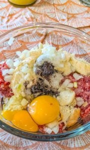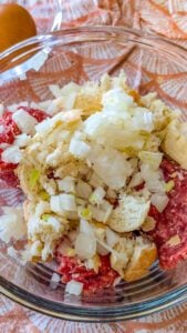 2. Add the torn bread pieces to the egg mixture and allow them to soak for a minute until softened. Add the soaked bread mixture to the ground beef and gently knead with your hands until everything is evenly incorporated. Be careful not to overmix.