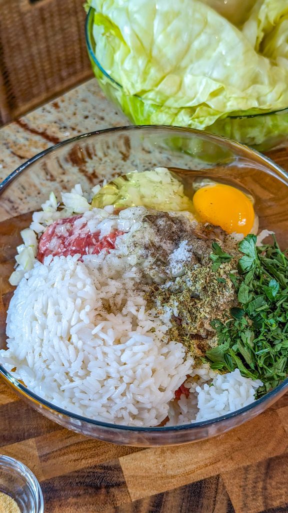 8. Stir the ground beef, rice, garlic, onion, seasonings, parsley, salt, pepper, and egg. You can use your hands to mix.