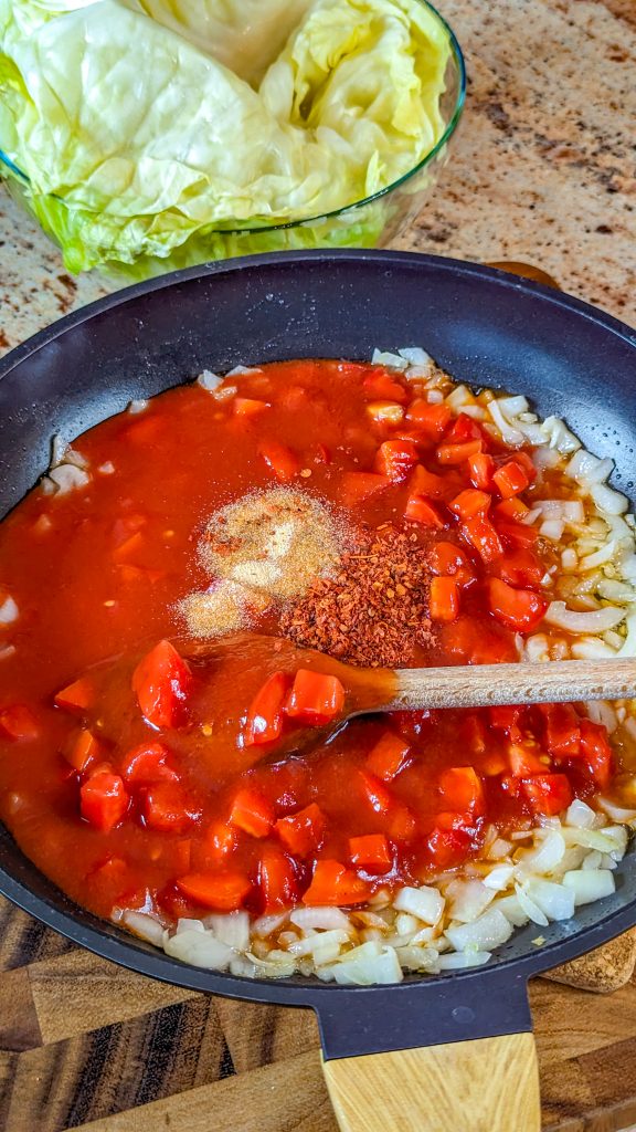 3. Stir in the minced garlic and then the canned fire-roasted tomatoes plus their juice, tomato sauce, salt, black pepper, and seasonings.