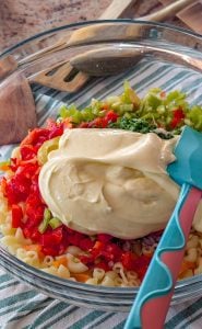 - Once the pasta has cooled, add the chopped vegetables and parsley to the bowl. Stir in the mayonnaise and Dijon mustard until everything is evenly coated.