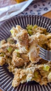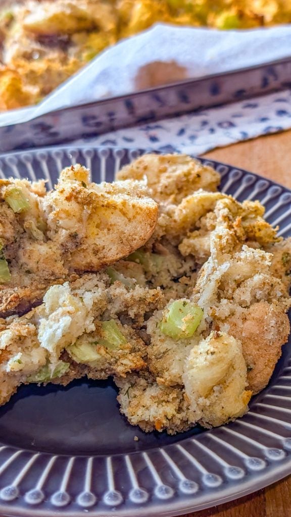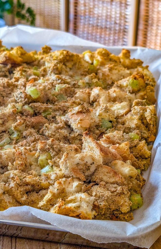 This stuffing keeps incredibly well. Store leftovers in an airtight container in the refrigerator for up to 4 days. For longer storage, you can freeze it: place cooled stuffing in a freezer-safe container or bag and freeze for up to 3 months. Reheat in the oven at 350°F until warmed through, and you’ll have the same comforting texture and flavor as freshly baked.
