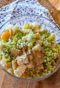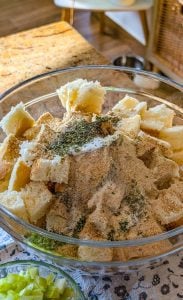 - In a large mixing bowl, add the cubed bread and the herbed stuffing mix. Toss together to evenly combine.