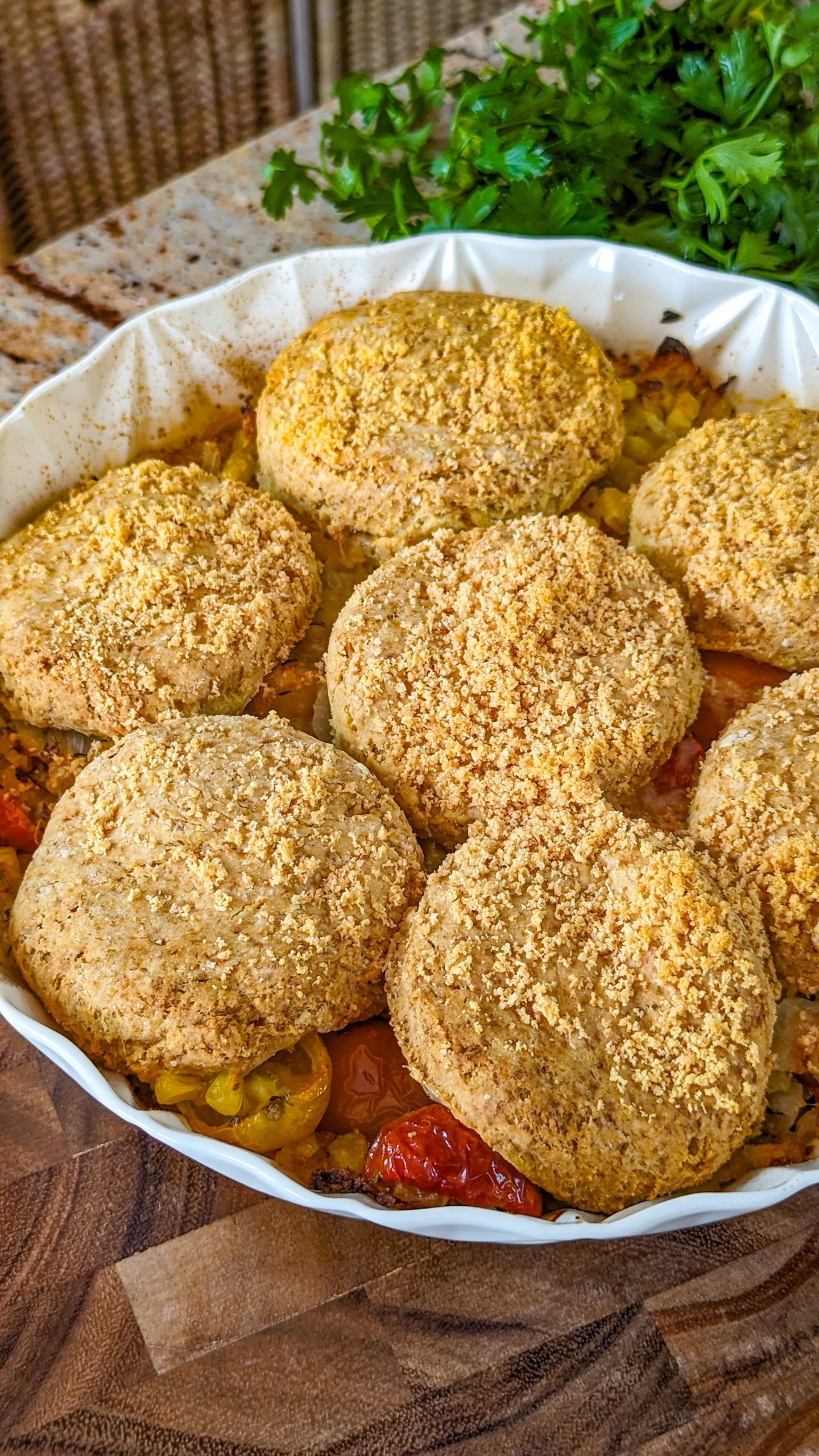 If the concept of a savory cobbler is new to you, get ready to have your tastebuds tantalized by this delicious recipe. In fact, your tastebuds are going to do a happy dance when you taste this! It’s versatile enough to make for a picnic, potluck, buffet, or to go with your Sunday roast. Even the leftovers are delicious, so don’t worry about making too much.