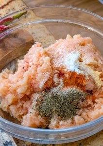 - In a large mixing bowl, combine ground turkey, olive oil, dried onion, garlic, salt, black pepper, paprika, thyme, cumin, Italian seasoning, and Worcestershire sauce. Mix until evenly combined.
