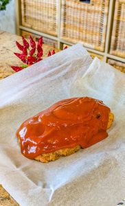 - Bake at 350°F for 35 minutes. While the meatloaf bakes, prepare the glaze: In a small bowl, whisk together ketchup, brown sugar, apple cider vinegar, and Dijon mustard until smooth.