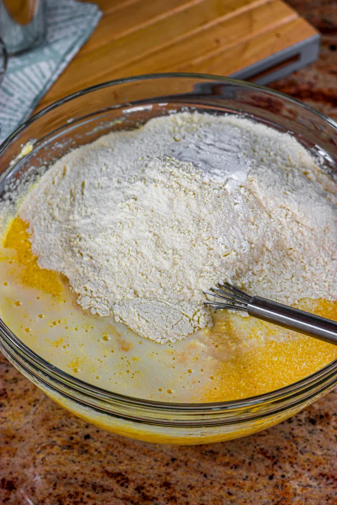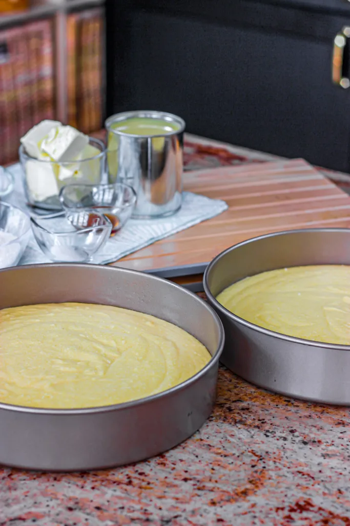 - Add half of the batter to the greased baking dish. Bake for 15 minutes.