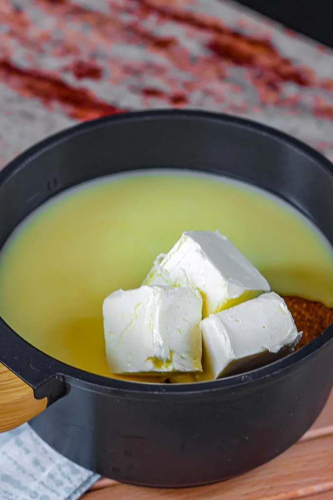 Step 4. In the meantime, add the caramel bits, evaporated milk, and butter to a saucepan over medium heat. Stir and cook until melted.