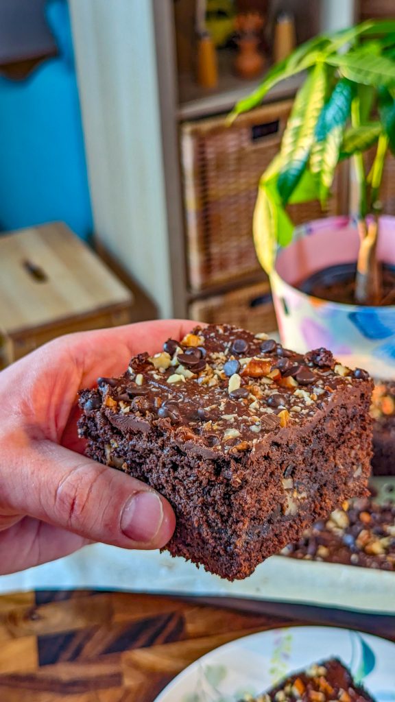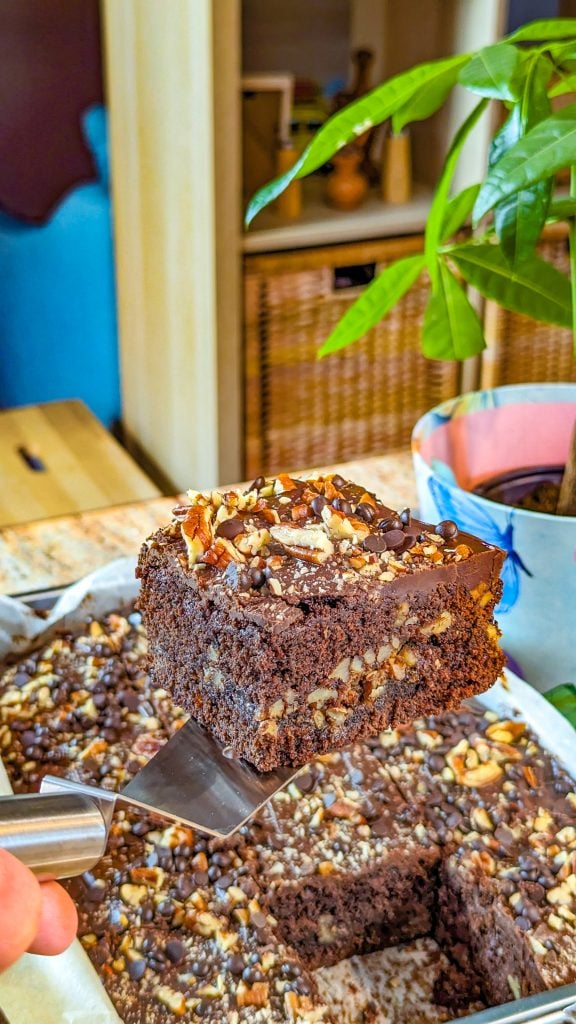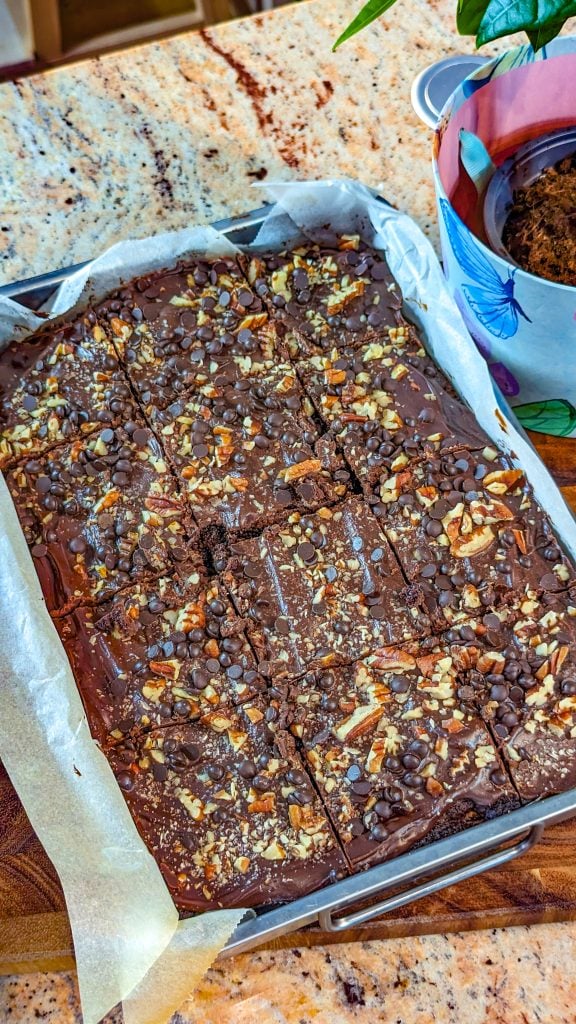 - Cool completely, then frost with the chocolate fudge frosting and sprinkle over more nuts and chocolate chips.