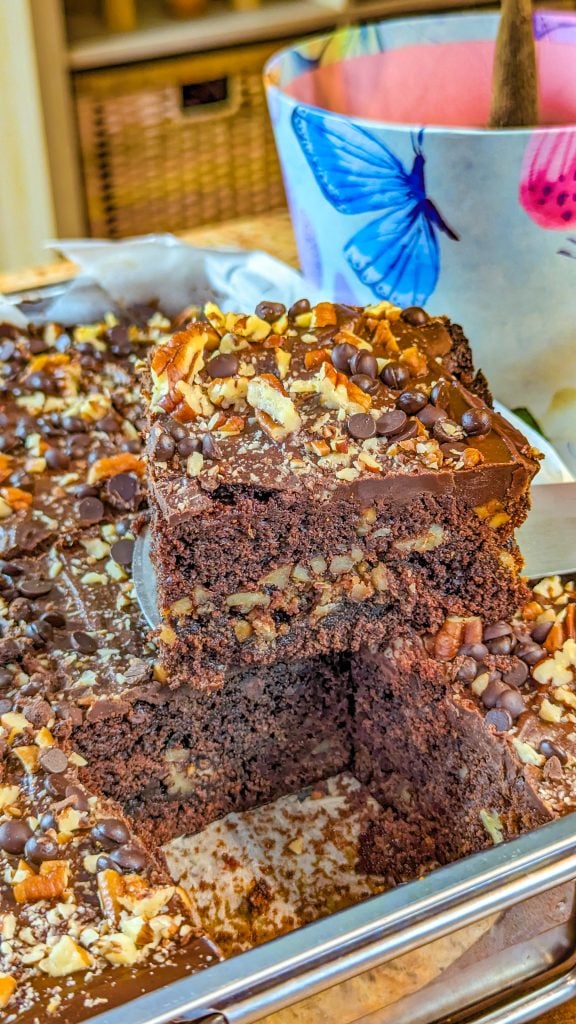 Perhaps your mouth is already watering reading about what goes into this turtle cake. It will water even more when you smell it baking in the oven! Cakes like this one are really hard to resist. It makes quite a lot, so if you’re cooking for a party or buffet, this would work well. It’s also good for potluck meals.