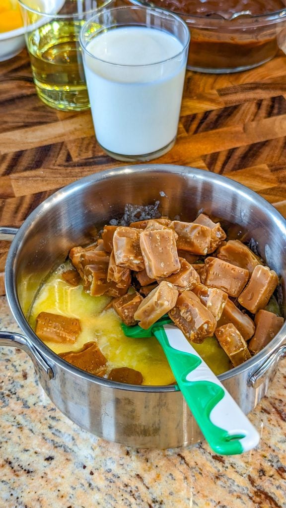 Step 2. Beat the cake mix with the eggs, oil, caramels, and milk until smooth.