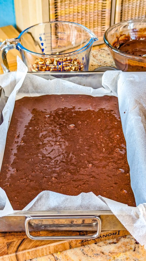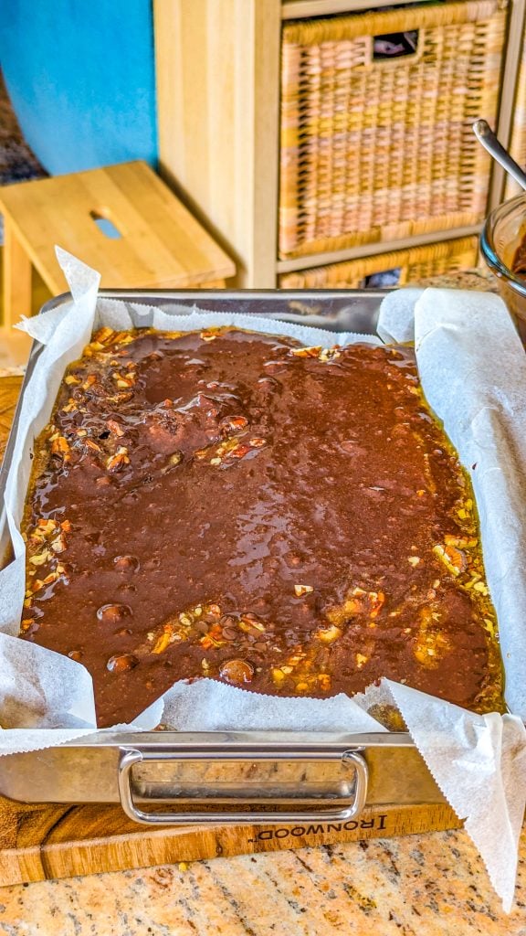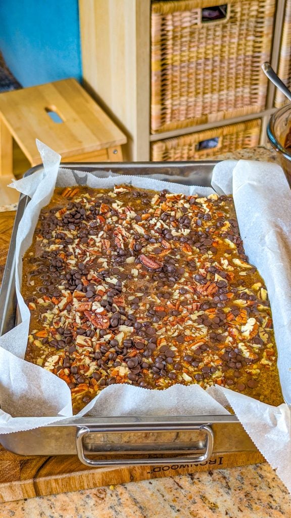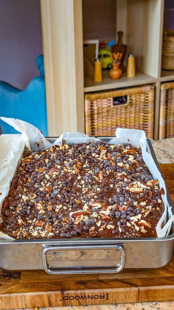 - Sprinkle the nuts and chocolate chips on top.
