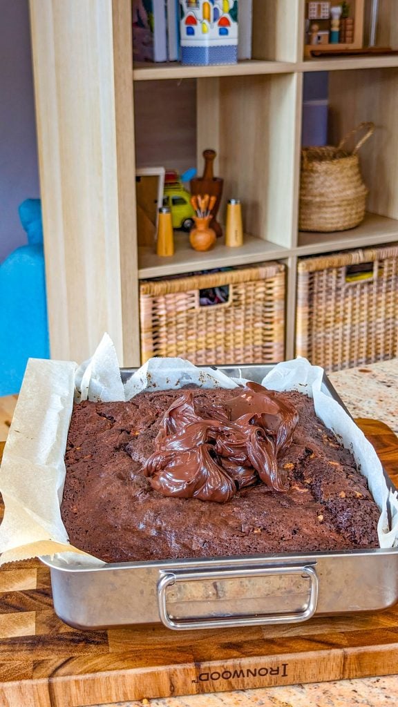 - Stir until smooth, then pour over the baked cake.
