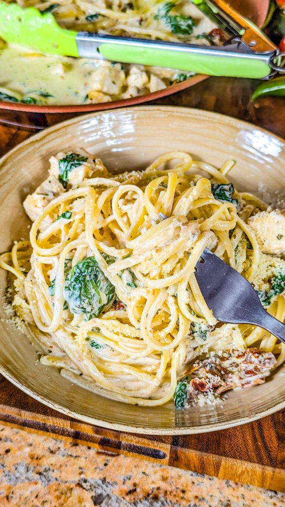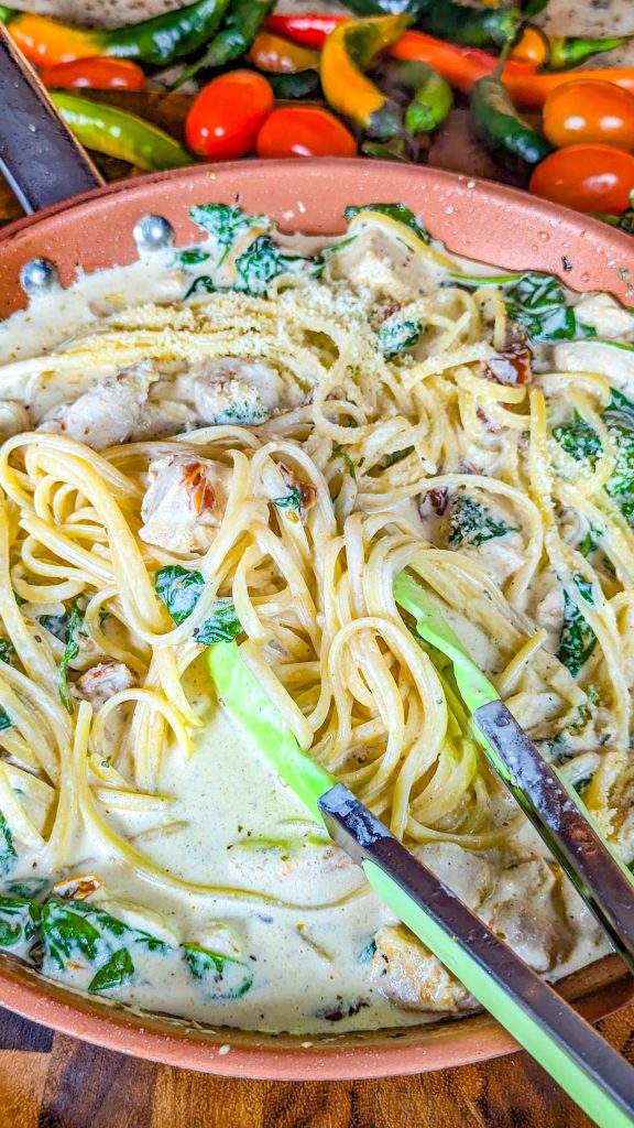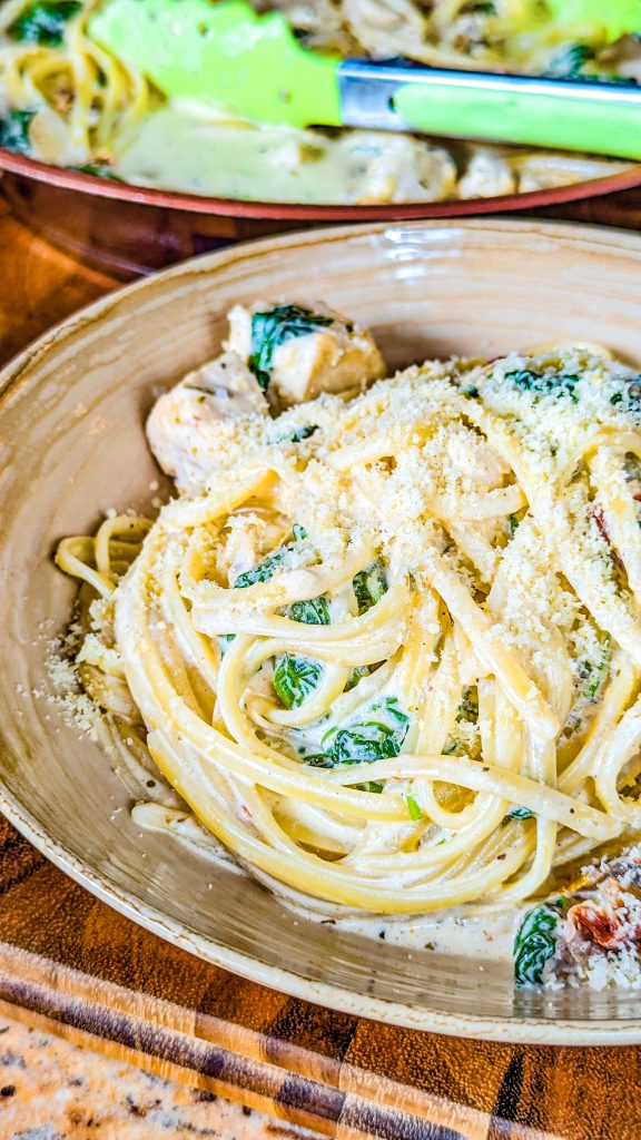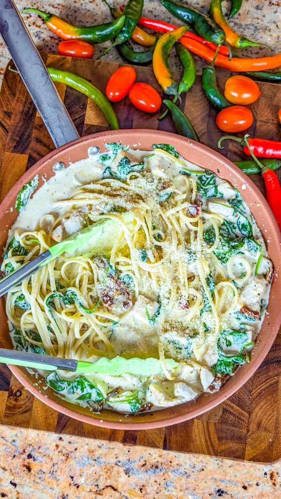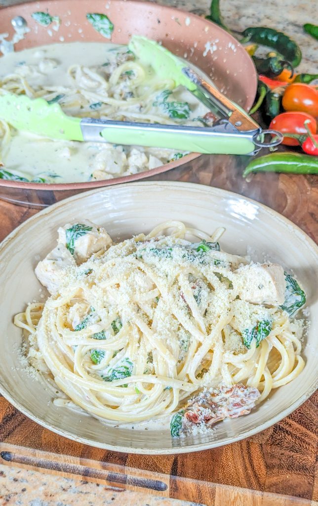 If you’re looking for comfort food and you go weak-kneed for delectable pasta dishes, you just have to try this one. It’s a Tuscan inspired chicken pasta dish made with juicy chicken breast, baby spinach, garlic, sun-dried tomatoes, and fettuccine noodles.