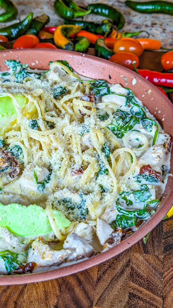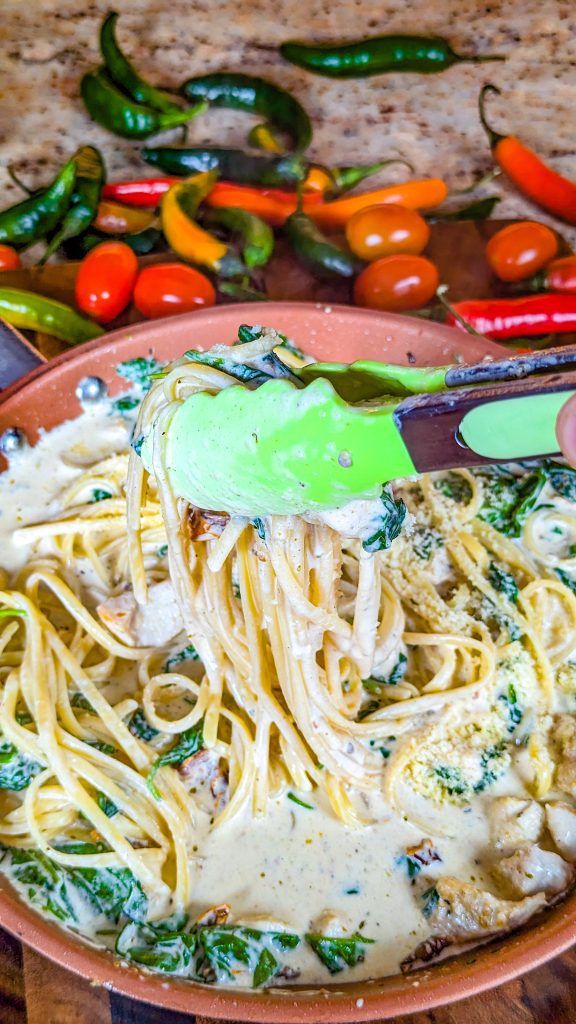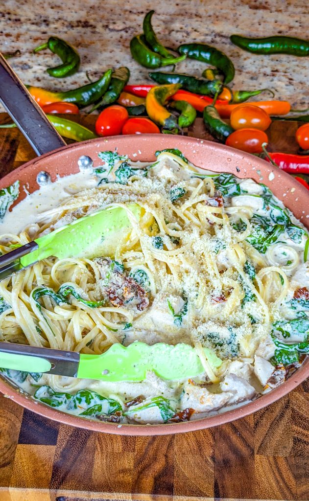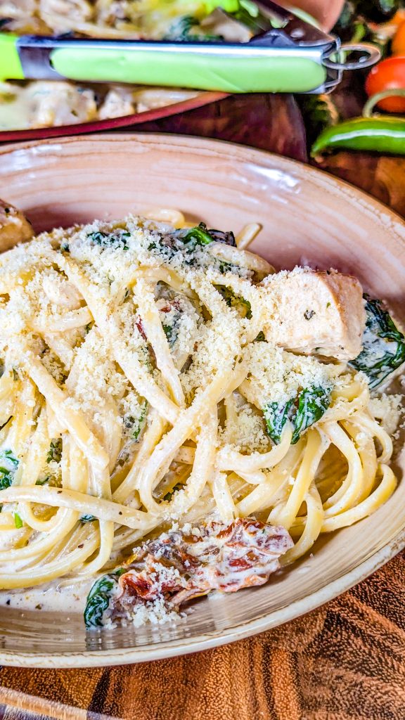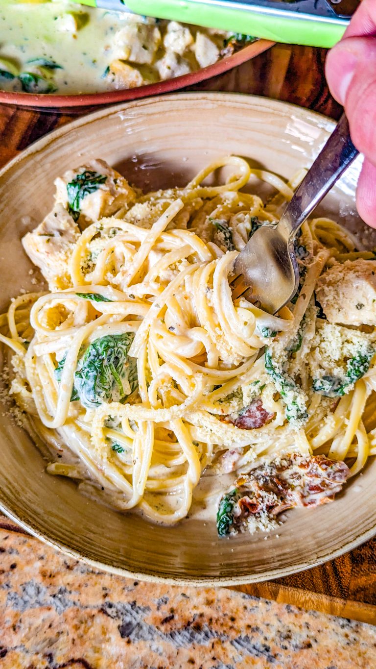 If you’re looking for comfort food and you go weak-kneed for delectable pasta dishes, you just have to try this one. It’s a Tuscan inspired chicken pasta dish made with juicy chicken breast, baby spinach, garlic, sun-dried tomatoes, and fettuccine noodles.