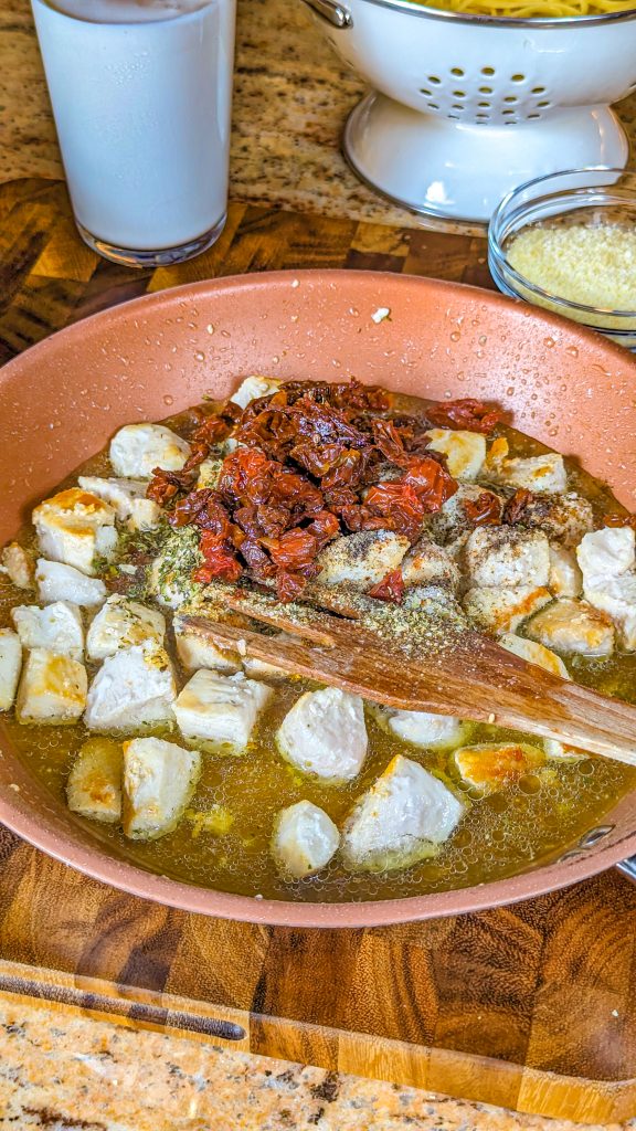 8. Add the sun-dried tomatoes, chicken and fettuccine and cook, stirring, until everything is warmed through.